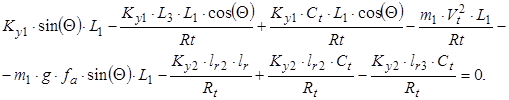 где Ку1 и Ку2 – коэффициенты сопротивления уводу колес соответственно передней оси и осей тележки автомобиля; Ct – смещение центра поворота относительно заднего моста автомобиля; L3 – расстояние от передней до задней оси автомобиля; Rt – радиус поворота автомобиля.