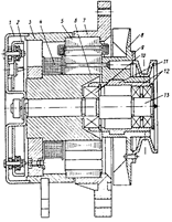 1- корпус выпрямительного блока; 2- теплоотвод; 3- крышка задняя; 4- катушка возбуждения; 5- статор; 6- ротор; 7- крышка передняя; 8- вентилятор; 9- шкив; 10- шарикоподшипник задний; 11- ступица ротора; 12- шарикоподшипники передние; 13- ось