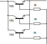 Средний ток коллектора одного транзистора равен Iк=10 А, при трех параллельно соединенных транзисторах суммарный ток через коллектор примерно равен IкS=30 А. Ток базы необходимый для насыщения транзистора при Iк=10 А не превышает IБ=150 мА, что для трех транзисторов равно IБS=150·3=450 мА. Постоянное напряжение транзистора Uкэ =350>175 В. В цепь базы включены резисторы по 50 Ом для уравновешивания токов базы, кроме того, для предотвращения лавинного пробоя транзистора в цепь эмиттеров тоже необходимо включить резисторы.